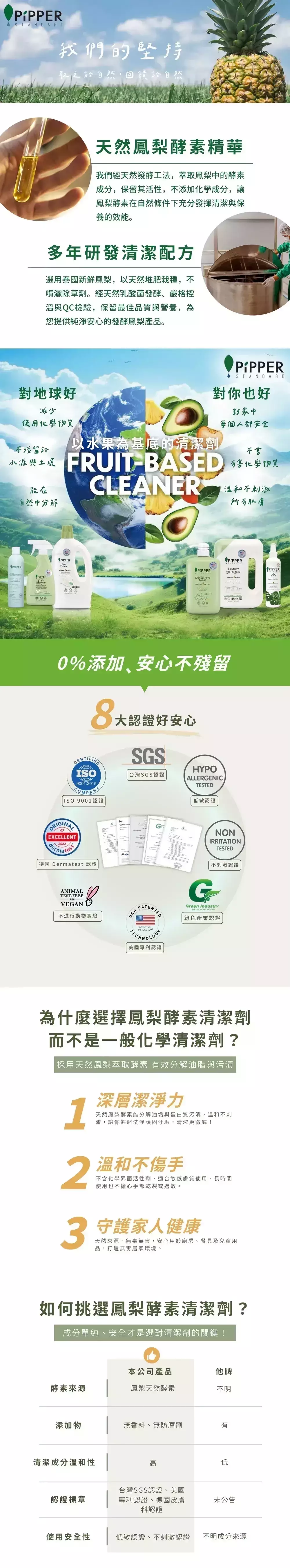 經過多年研發,PiPPER 成功開發專利鳳梨酵素技術,成為產品核心基礎,帶來高效天然清潔力。